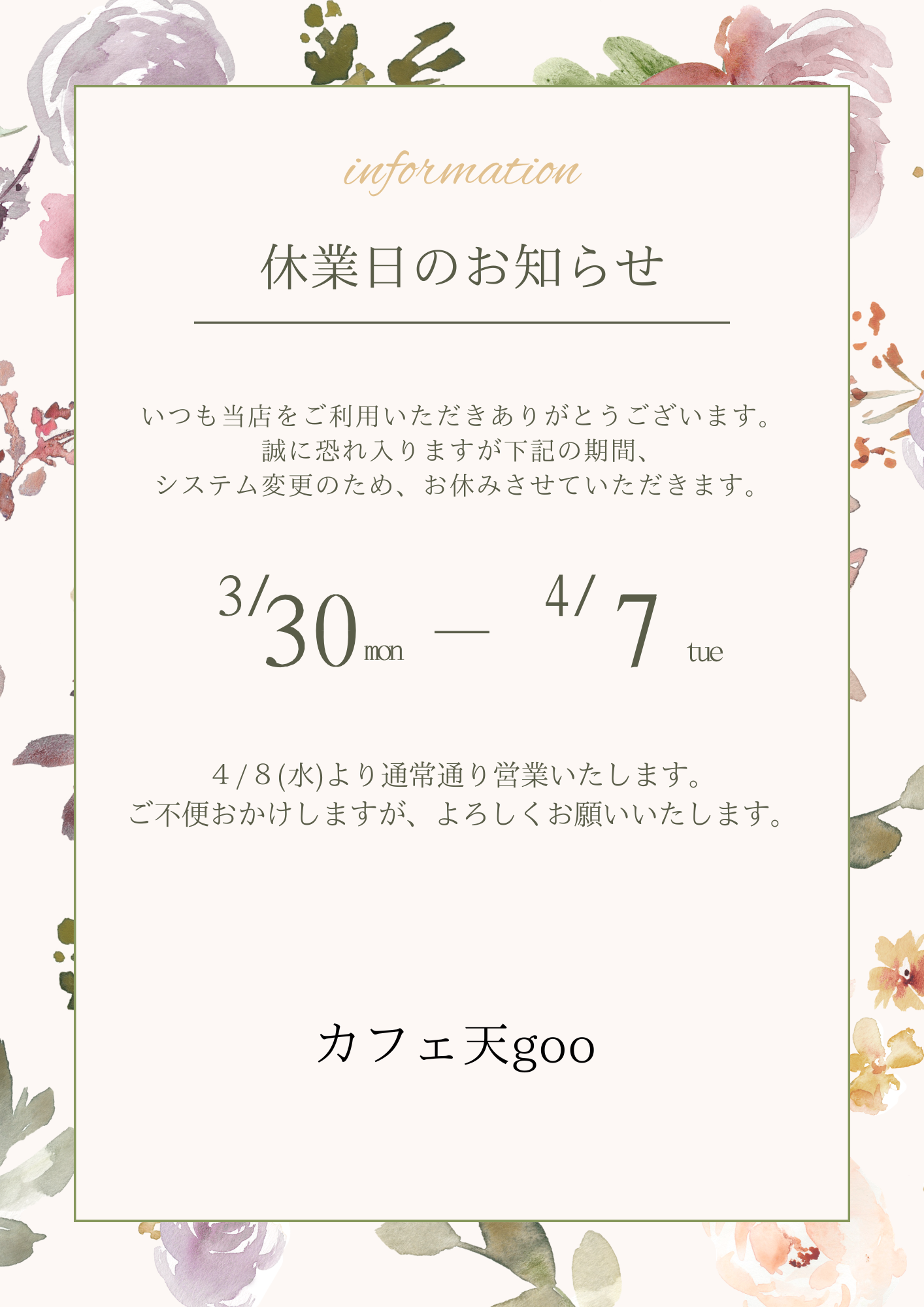 2026年4月8日(水)からは通常どおり営業いたします。